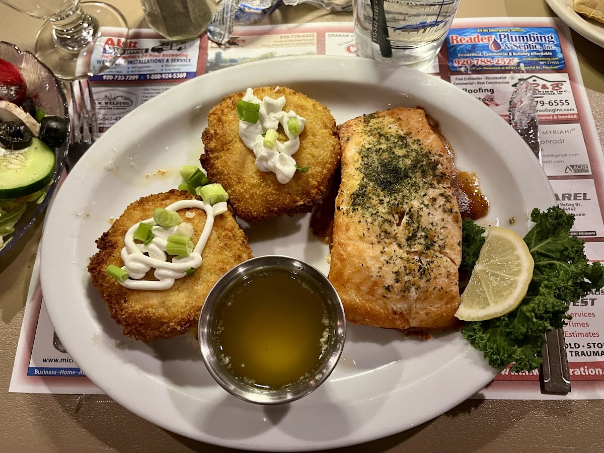 Small hidden gem outside of Hortonville, WI, this supper clubs appears to be a home nestled in the woods with a pole barn bar behind it, but what's inside is a beautiful example of a traditional Wisconsin Supper Club. We were waited on by an amazing bartender that made my guest some amazing drinks, including her signature Salted Caramel martinin, which did not disappoint, and she was welcoming and made sure we had what we needed, even though the place was packed and she was very busy. Our server greeted us, took out order and let us know our table number and to help ourselves to the soup and salad bar. The salad bar was small yet packed with fresh ingredients one would expect at a Supper Club, the amazing prime rib soup was robust and warmed my tummy on a cold winters night. My guest ordered the tenderloin while I got the king cut prime rib, al Oscar, with the signature potato cakes. Hands down the best in the area. Warm yellow hollandise and the lumped crab with asparagus flowed over my generous portion of prime rib. My guests tenderloin was so good, she doesn't want to eat it anywhere else. Our server was amazing and we had plenty for leftovers to savor the taste again tomorrow. A+++++