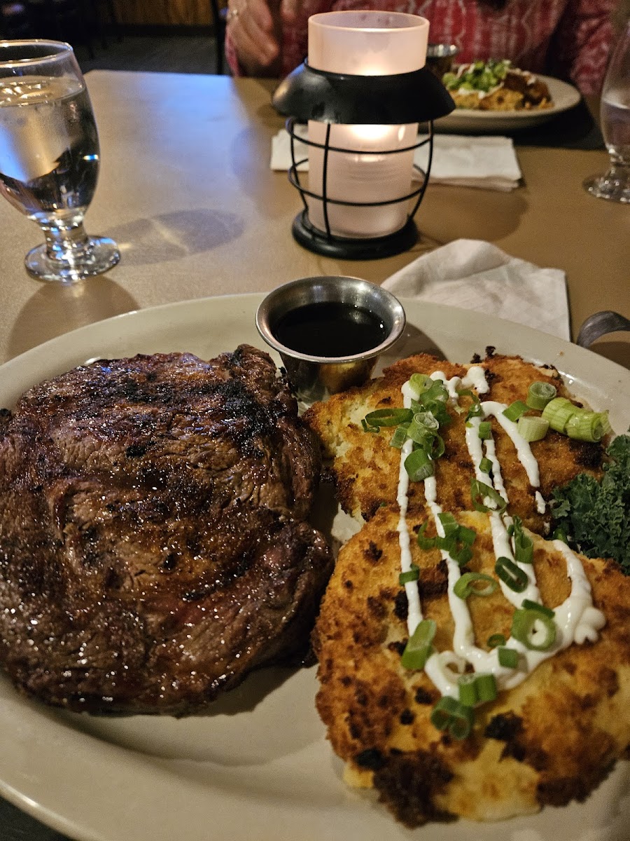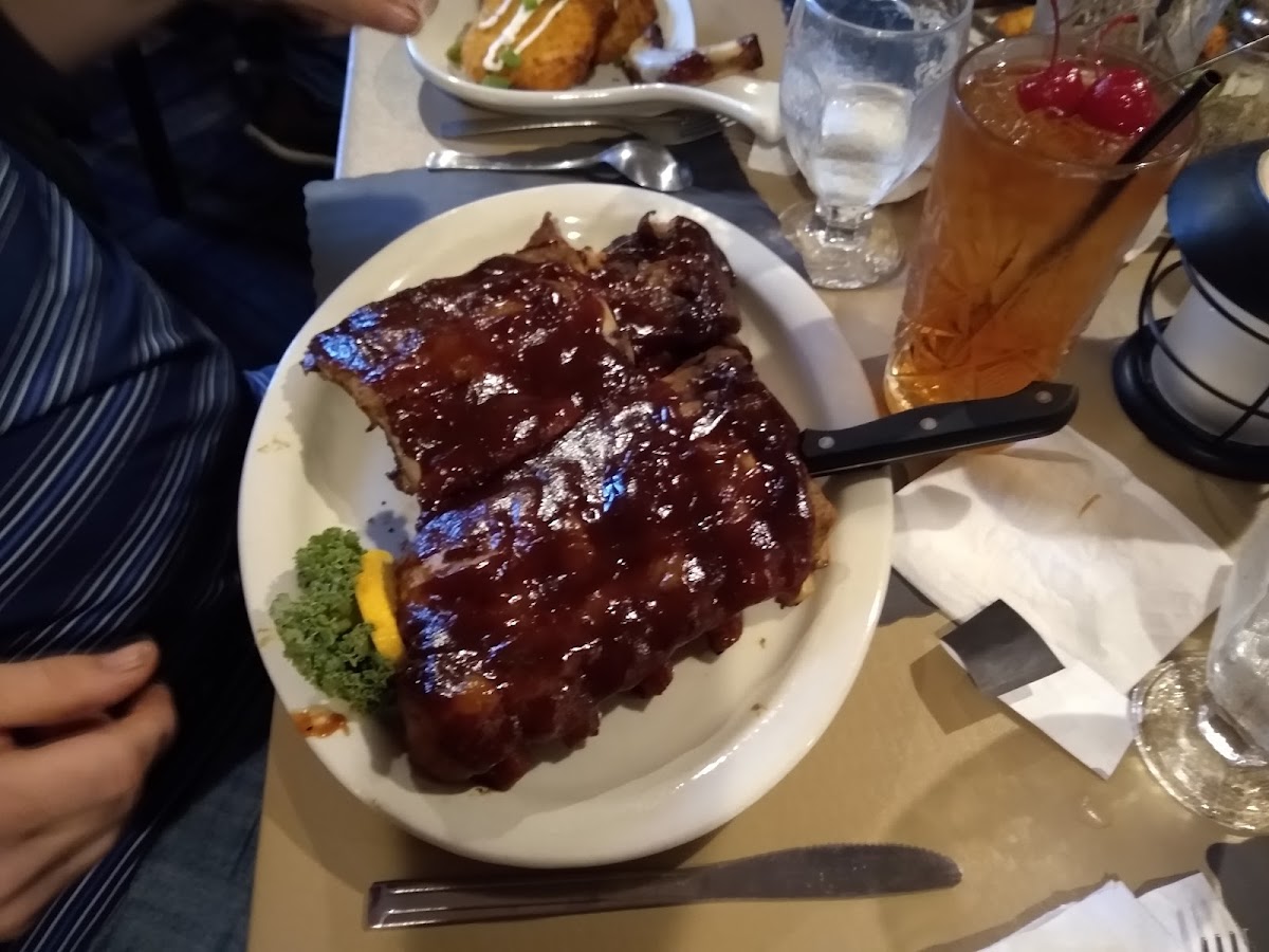 Black Otter was absolutely packed at 415 so we stumbled upon MJ's and gave them a shot. Atmosphere was friendly, much quieter than Otter. Didn't have to fight to get to the bar Prime rib had an interesting flavor, couldn't put our finger on it but definitely not a standard prime rib rub. A little sweet almost, just not our style. Ribeye was flavorless except one area that was heavily salted. Tenderloin filet was absolutely delicious. Ribs were excellent as well. Garlic mashed potatoes were flavorful but very dry. Potato cakes were excellent. No drink service at table and that was fine but hard to get water glass refilled also. All in all it was still a good experience.